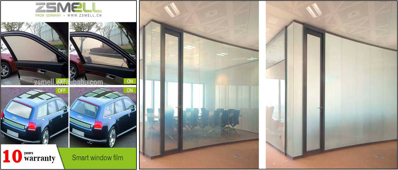 智能調光膜與抗靜電塗液。智能調光膜是在兩片透明高分子導電薄膜中間夾有液晶和聚合物的混合物,在沒有電場的作用下,液晶微滴光軸雜亂無章排列,使得光線在液晶微滴和網狀聚合物的界面發生米散射,從而呈現不透明的狀態,而在電場的作用下,液晶微滴光軸有序排列,使得光線可以穿透液晶微滴和網狀聚合物的界面,從而呈現透明的狀態,如圖4-1所示。