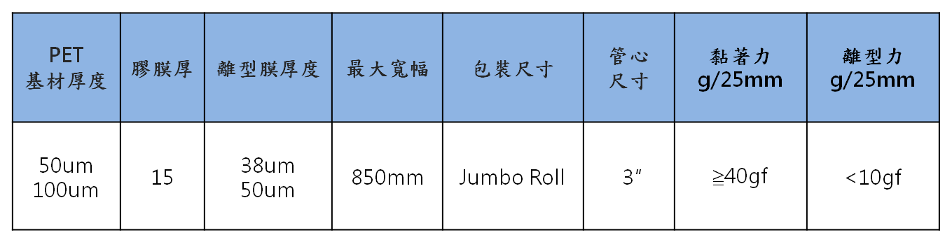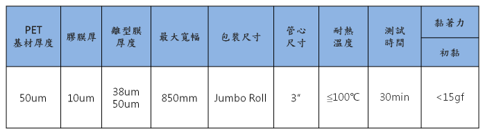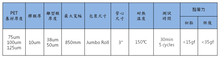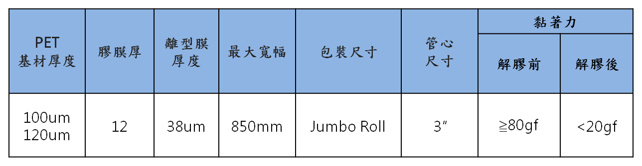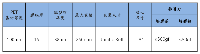 邊框黏貼工件使用,初始黏力可達2公斤以上使工件不鬆脫,產品特性在於具備可重工性,膠帶貼覆後受熱達100度左右即可順利解膠將工件取出,不使工件受損。