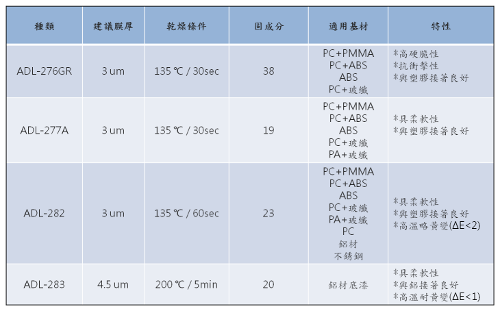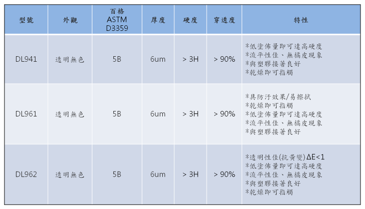 抗靜電塗液是用在PET,PC等塑膠基材上之抗靜電材料,終端客戶為電子級包材或IC載帶等特殊規格包材,每月需求達百萬噸等級。阻值需求依客戶規格從103 ~ 105 ohm/sq到106 ~ 108 ohm/sq, 甚至109 ~ 1011 ohm/sq等不同需求 。